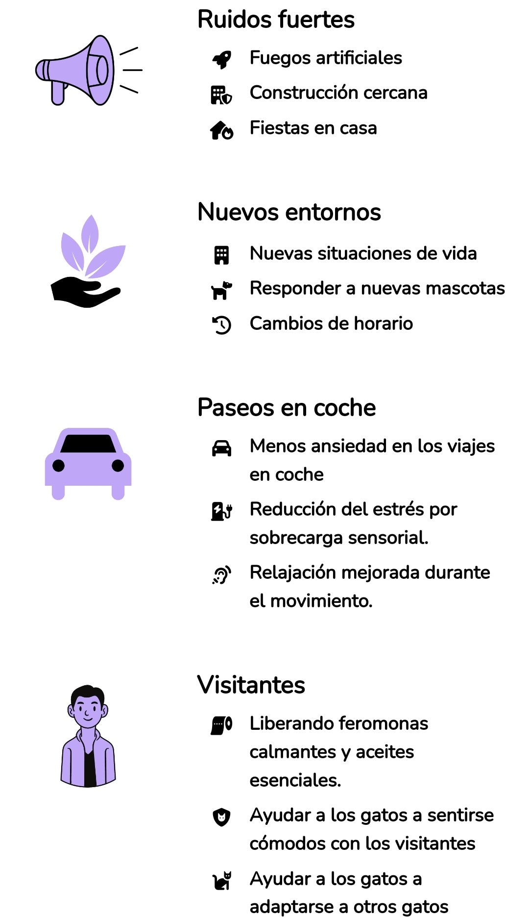 Funcionó muy bien para mis gatos. En cuestión de minutos, uno de mis gatos comenzó a actuar con más calma. Le ayuda a tener menos miedo de nuestros otros gatos. También utilizamos un collar para uno de nuestros gatos que es acosador y, en los primeros días de uso, redujo su comportamiento agresivo y ahora es más amigable con los demás gatos.