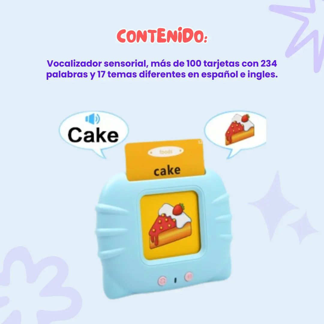 Vocalizador sensorial, más de 100 tarjetas con 234 palabras, 17 temas diferentes en español e ingles y 1 guía de uso.